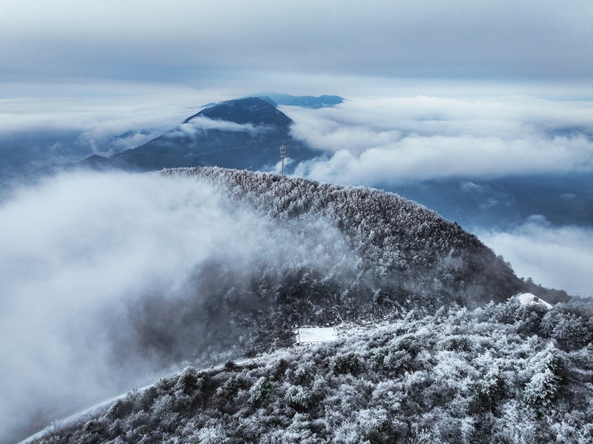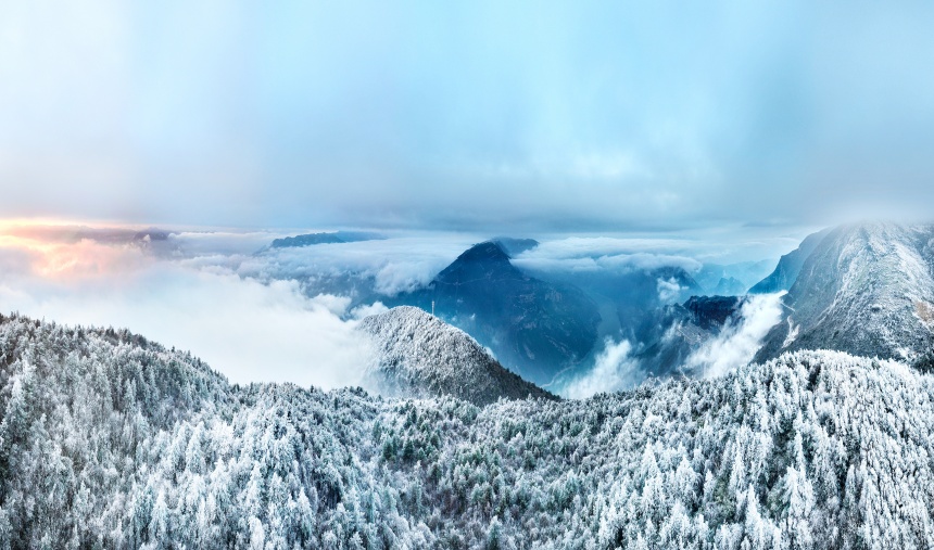 人民网重庆12月8日电 (刘政宁、常碧罗)受冷空气影响,重庆市巫山县高海拔地区近日迎来降雪天气。长江三峡巫峡两岸银装素裹,云雾缭绕,美不胜收。