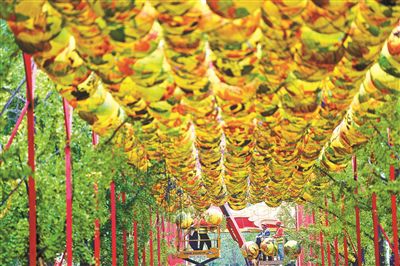 工作人员为《中轴线之光》灯组悬挂彩灯
