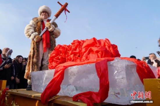 7日的采冰节,以“新形式”演绎了习俗。百名演员穿着传统采冰服饰跳起“采冰舞”,江面上鼓响旗扬,千人同唱“采冰号子”,尽显东北热血豪情。在“系鸿运”部分,象征吉祥的红绸由冰把头交给现场观众接力传递,象征薪火相传。“头冰”出水后,现场一起诵读《头冰颂》。