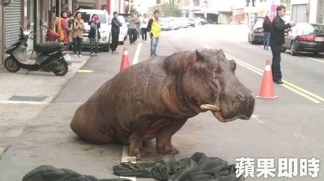 台湾苗栗苑里路上,突然出现庞然大物,竟然是一只河马!这只河马从货车上掉落,在路上奄奄一息。