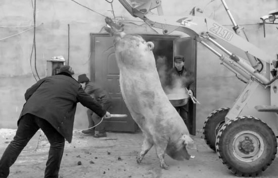 这头猪实在太大了,不用铲车可没人能搬动它