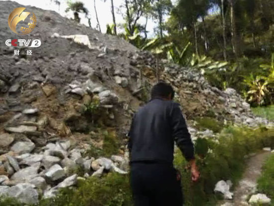 在调查时记者发现,很多矿洞的不远处便是当地村民的菜地,我们看到,挖矿时出现的矿渣堆起一座座小山,矿渣的边缘已经接近菜地,原本云南山区就是山多地少,如今,很多耕地也被矿渣掩盖。对于山上黄龙玉的私挖滥采,山下居民也是苦不堪言。