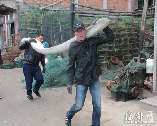 船上的人都是出海几十年的老渔民,可捞到这么大的稀罕物还是少有,骨头3米长左右,100多斤重,闻起来特别腥。