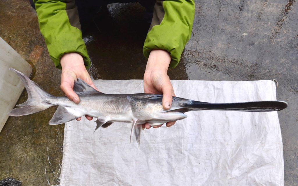 2015年3月26日,安徽省巢湖市,家住巢湖市的佘师傅在巢湖闸附近水域钓鱼,一不留神钓出一条“怪鱼”。这条“怪鱼”身长约80厘米,而且吻部(嘴巴)形似鸭嘴和扁平的汤匙,长约20厘米,体重约1.5斤,外形与中华鲟相似。“怪鱼”的头部还布满了规则的花纹,身上光溜溜的,没有一片鳞片,背部呈深灰色。佘师傅说,钓鱼钓了几十年,还是第一次碰到。水产专家经过初步鉴定后确认,这是世界珍稀鱼类——匙吻鲟。这条匙吻鲟很可能是人工养殖,不慎游进巢湖的。马丰成/CFP |