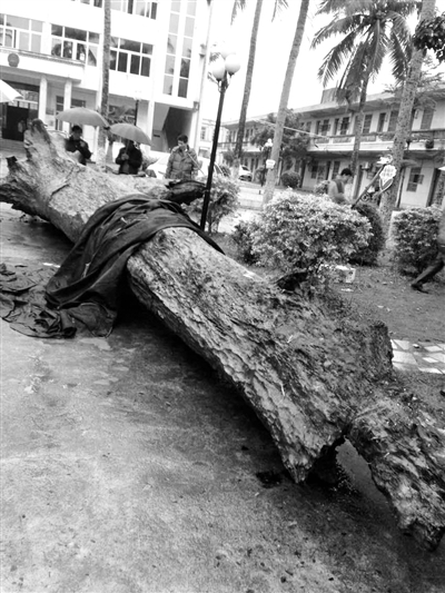 4月1日,在会文镇政府大院内,这根巨大的古树干被政府精心地呵护着。