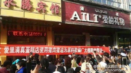 5月1日14时许,西宁市城东区有穆斯林群众在东关大街A里蛋糕清真店食品配送车内发现非清真制品,认为该店出售非清真食品,部分穆斯林群众将该店设施砸毁,无人员受伤。