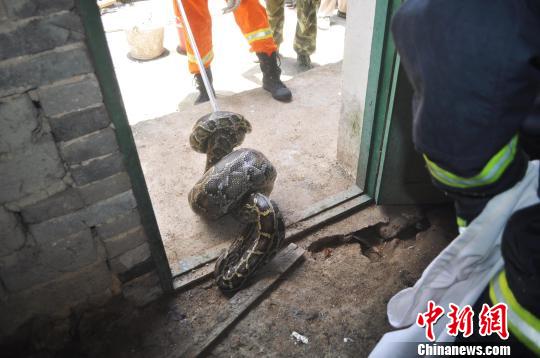 消防官兵询问屋主得知,当天早上8时许,女主人到鸭舍喂鸭,发现一条3米多长的大蟒蛇正在自家鸭笼里吞食鸭子,女主人当场被吓坏了,立即拨打110报警。