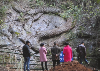 石龙雕刻位于石龙村的石龙沟,在山沟里的一处半山腰上。昨天下午,京华时报记者赶到现场时,多名当地人正在石龙下方堆砌石头,准备做成堡坎,防止石龙周围再被泥土及滑坡掩埋。