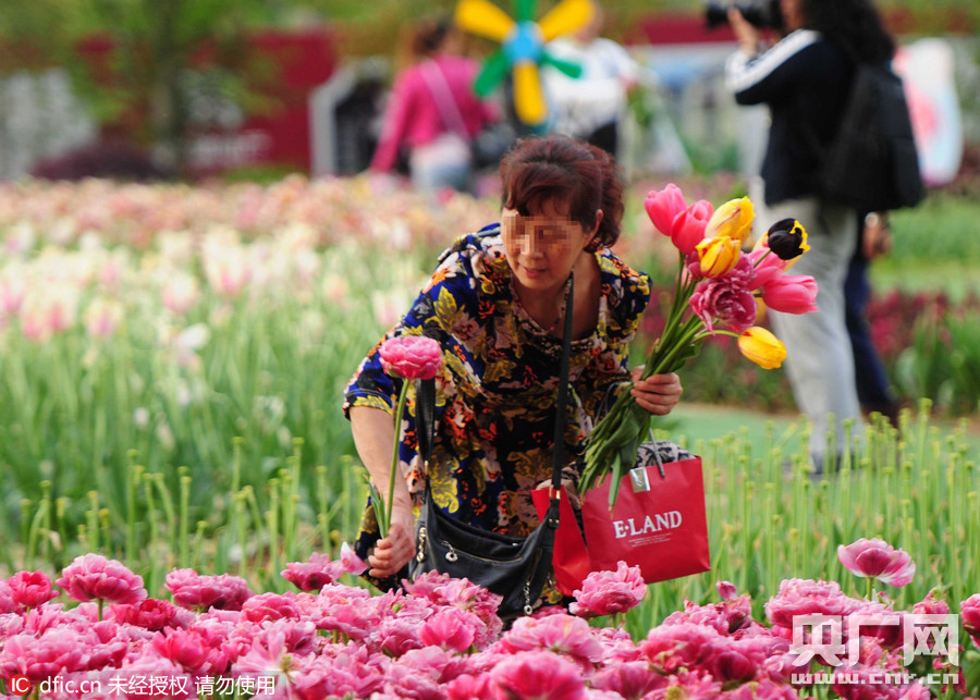 2016年4月10日,市民在江西九江第五届郁金香花博会上采摘郁金香。自3月26日开始,江西九江第五届郁金香花博会开幕,20余万株品种各异的郁金花竞相怒放。在双休日,一些市民乘着工作人员不注意时,随手采摘郁金香、任意踩踏花田的不文明行为时有发生,全然不顾花海中安插的警示牌。