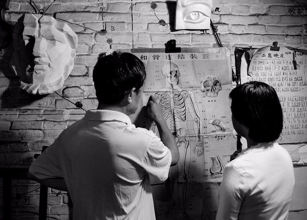 图为2015年7月16日,李婧磁在和父亲研究解剖图。