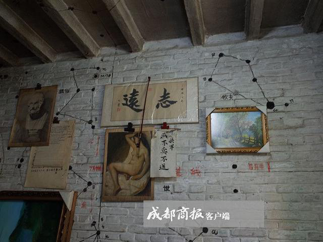 李铁军一家住在一楼,客厅墙壁和屋顶画着各种星座图,狮子、小熊一应俱全,几幅油画和石膏像挂着,还有一幅裸女画是李婧磁妈妈李安素所画,其他山水画则是李铁军的作品,一张“铁军画不卖不送”字条被虫蛀了几个窟窿,质地看起来很清脆,吊扇一吹就飘来飘去。靠窗的地方摆着一台电子琴,另一边书桌上摆着《人体解剖入门》《素描技法》《名家国画技法·古代仕女》等书,旁边墙壁上挂着一块小黑板,上面用粉笔字写着“知识就是力量”。和11年前相比,屋里并无太多变化,只是新增了笔记本电脑、WiFi和一笼共5只虎皮鹦鹉。