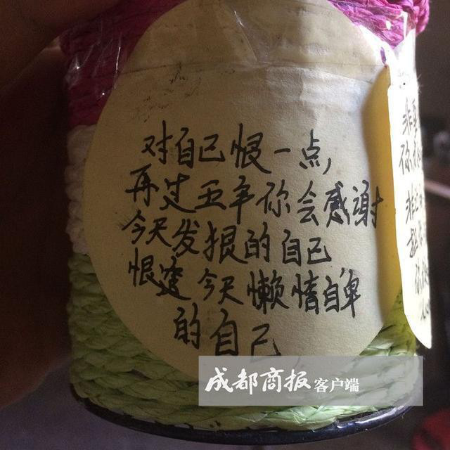 李家屋里有一份李婧磁的日程表,上面写了每天要做的事。学习:画画、音乐、看书、背书、练字;运动:拉伸、下蹲5组(40个一组),仰卧起坐6组(50个一组),跳绳一千下,羽毛球、篮球、跑步;家务:打扫、洗衣、做饭。在书桌上的一个笔筒上,还贴着两张便笺,其中一张写着“对自己恨(狠)一点,再过5年你会感谢今天发狠的自己……”旁边有一沓古诗词小卡片,大概有四五十张,有《鹅鹅鹅》、《天净沙·秋思》等古诗词。李铁军介绍,这些卡片是以前学习使用,“现在早不用了”!