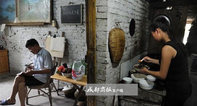 图为2016年8月17日,李铁军在客厅,李婧磁在做饭。