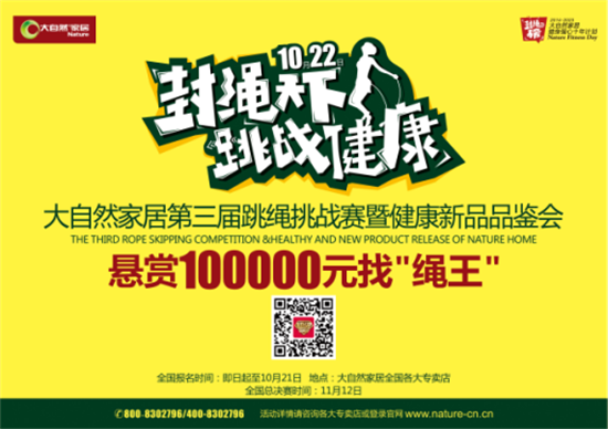 据悉,近期,大自然家居已经在全国5000多家终端门店,同步启动“封绳天下、跳战健康”报名及初选,将在全国通过海选和晋级赛,挑选出10名跳绳牛人,于今年11月12日大自然家居总部举行跳绳挑战赛总决赛,挑战吉尼斯纪录,选出新一代“绳王”。