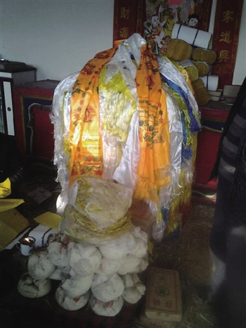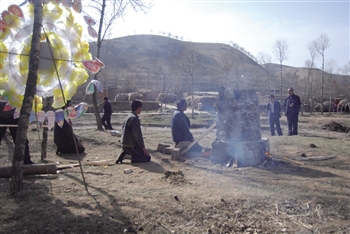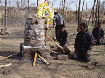 下午三点多,桑杰阿爹的遗体火化者们回来了。照规矩,孝子们要在门前跪迎。旦见阿妈已经在门前放了一堆大火,火中放入柏香。火化者和孝子们洗脸洗手,从火堆上跨过后进入家门。五点钟,桑杰阿爹的骨灰充分冷却了,祁家的一家人又聚在了火化场。由年龄最大的大伯开始,每人拣拾一块骨头置于一个长方形的木盒中,这就是土族人的骨灰盒了。这样轮换着来拣拾,直到最后一块。紧接着,叔伯阿爸已经找了处向阳避风的地方,将那个小方盒子埋进了土里。照土族人的规矩,桑杰阿爹的骨灰要等到来年清明时才能移到祖坟上。