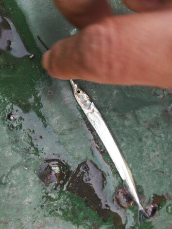 这条怪鱼只有成人的手掌长,尖而细长的嘴几乎占了鱼体的一半。细细观察,它的头长且扁平,上颌短,下颌延长,看起来就好像一把长剑,身体细长而扁,头部呈蓝绿色,体侧银白。
