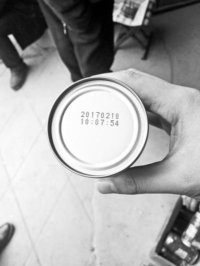 可是,这些福利拿到家里后,有细心的村民发现,饮料的生产日期不对劲儿。昨天,一位村民搬出来一箱饮料给记者看,包装上显示“板栗原浆板栗汁饮料”,可是包装箱上的生产日期是2017年2月10日。打开包装箱后,每罐饮料的罐身上印着“生产日期见罐底”,而罐底的日期也显示“20170210”。