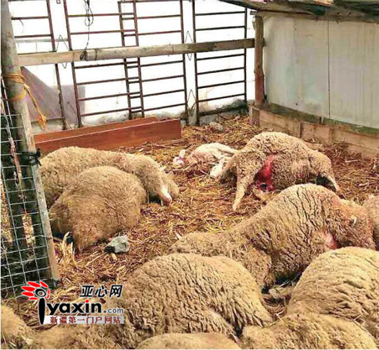 1月24日8时左右,27岁的居曼·达吾提去羊圈喂草,还没走到羊圈就听到“咩咩”的哀叫声,他走进羊圈,发现地上横七竖八躺着被咬死的羊(如图),连不到两个月的小羊羔也被咬死了,羊圈里还卧着一只烟灰色身上带斑点的雪豹,见此情景,居曼·达吾提急得哭了起来。邻居努尔·阿西木闻讯赶来,拨打了当地派出所的电话。
