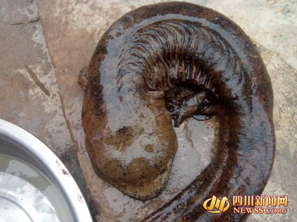 3月1日晚间时候,家住泸州市合江县实录镇觉悟村的村民罗远华上山捡柴,途经家附近的磨刀滩大桥时,发现桥下小溪的石滩上有动静。“看见一个巨大的东西爬在地上,有点像鲶鱼。”罗远华告诉四川新闻网记者,走近一看,这鱼还是一动不动,奇怪的是鱼上有脚。“还没见过这么大的怪鱼,不知道是不是稀有动物,有没有受伤,先保护起来在说。”