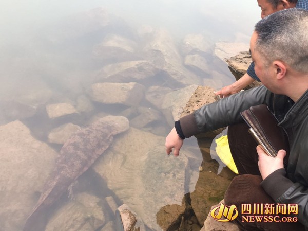 今(2)日上午,当地派出所和实录镇农技站农技员赶往现场,初步判断是条娃娃鱼,并及时通知了该县水产渔政局。