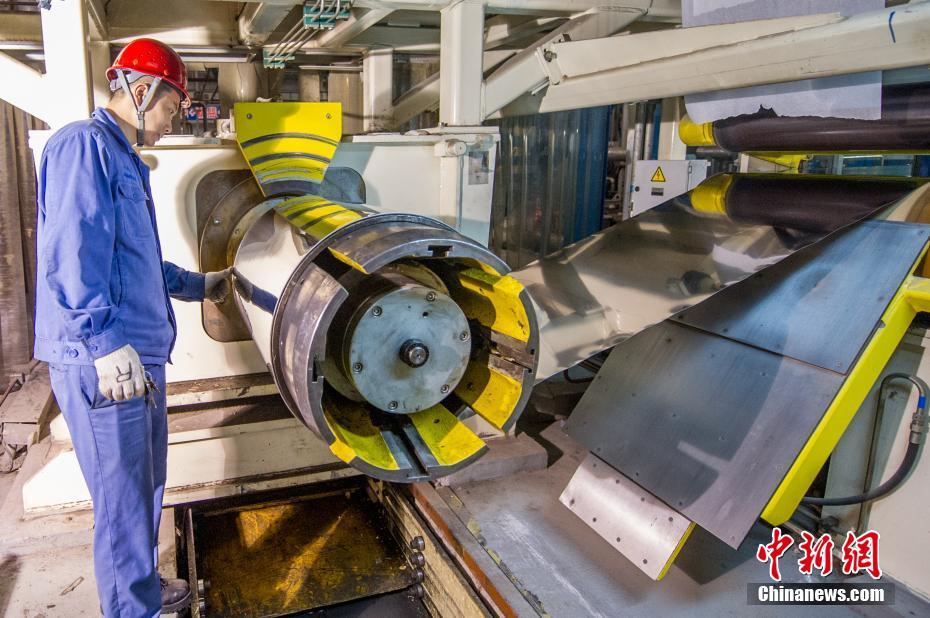 8月8日,山西省太原市,太钢精密带钢公司工作人员使用机器生产厚度为0.02毫米,宽度达600毫米的不锈钢。这种不锈钢于日前开始量产,预计月产量达到3000公斤左右,主要应用在航空航天、石油化工、汽车、电子、家电、计算机等领域。在此之前,该产品因工艺控制难度大,长期被日本、德国等国家垄断。 中新社记者 韦亮 摄