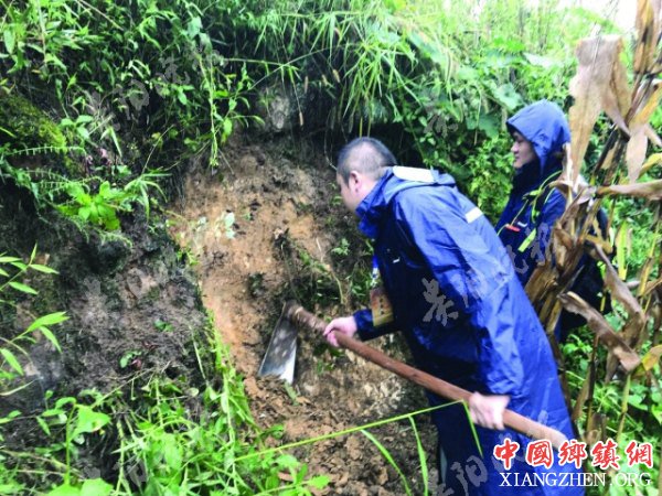 上午,调查队地下组调查人员冒雨在村前的田野中调查时,清开一处田埂上的杂草,打算通过简易方法勘探地层。仅仅数分钟后,三枚陶质网坠便呈现出来。经来自贵州省文物考古研究所的调查队员对比和分析,初步判断三枚网坠为汉晋时期物品。
