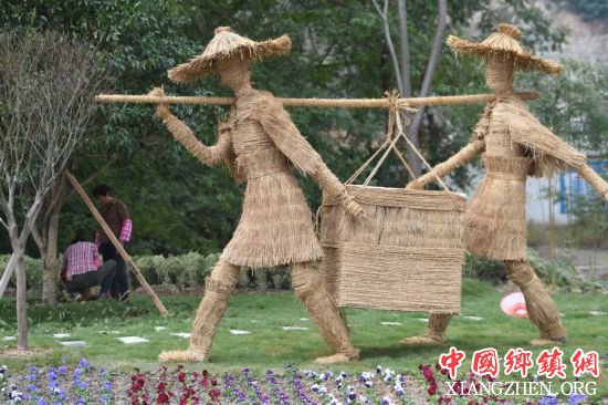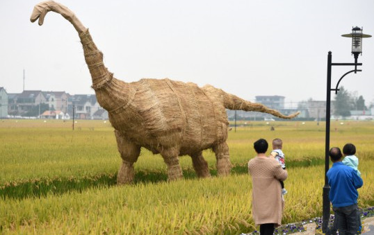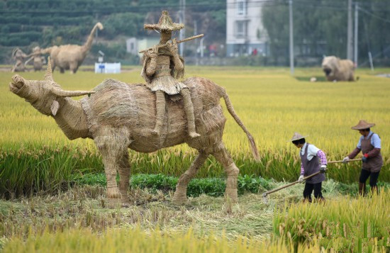 11月5日,在杭州富阳渔山乡省级粮食生产功能区稻田里,工人在布置创意稻草人,有恐龙、长颈鹿等动物造型,还有耕种的农夫等人物造型,惟妙惟肖。2018杭州富阳 渔山稻香节将于11月11日举行。(浙江在线记者 吴元峰 摄)