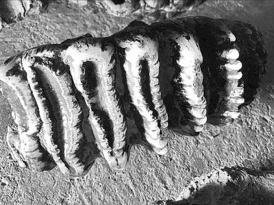 新发现的巨大的牙齿化石表面有一道道棱状凸起,好像搓衣板的沟纹,化石表面晶莹剔透,如玉石一般,看起来十分坚固耐磨。这些巨大横向排列的牙齿化石立刻让人联想到猛犸象的牙齿,科学考察组成员沿着水沟继续往上游搜寻,接着又发现了一块中空的疑似大象门齿化石和两块巨大的臼齿化石,另外在碎石和泥沙中散落着几块肢骨化石。