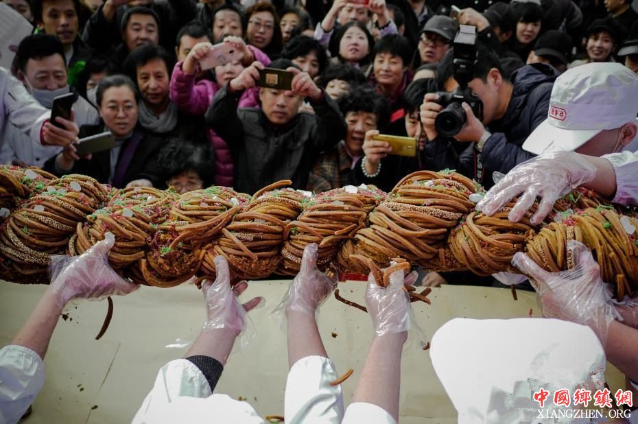 11月18日,天津麻花文化节在天津意式风情街桂发祥十八街麻花体验店举行,消费者共同分享了一支重118斤的巨型麻花。中新社记者 佟郁 摄