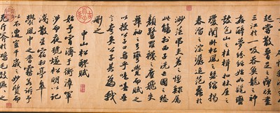 《洞庭春色赋·中山松醪赋》卷是目前所见苏轼传世书法中字数最多的作品,现藏于吉林省博物院。《洞庭春色赋》作于元祐六年(1091年),当时苏轼在颍州任上。安定郡王赵世淮以黄柑酿酒,取名“洞庭春色”。赵世淮之子赵德麟当时任颍州签判,与苏轼关系友善,以洞庭春色酒赠送苏轼,苏轼乘兴作《洞庭春色赋》。元祐八年(1093年),哲宗亲政,苏轼外任定州,他在定州以松醪酿酒。定州是古中山国所在地,故苏轼将酒取名中山松醪,并作此赋。苏轼用李氏澄心堂纸、杭州程弈鼠须笔和张传正送他的易水供堂墨,完成了这幅大气而精致的书法。