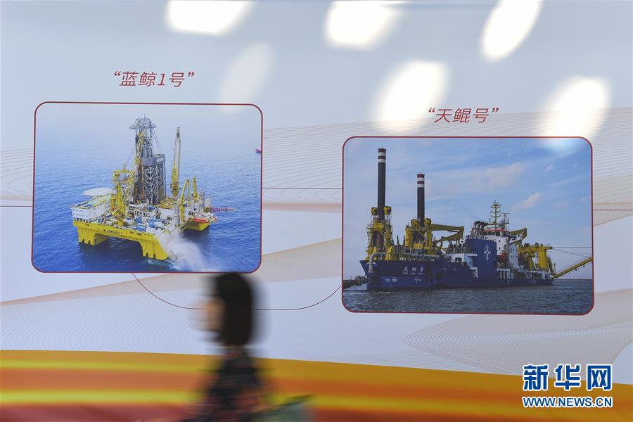 10月15日,与会者经过“蓝鲸1号”钻井平台与“天鲲号”自航绞吸挖泥船展板。 新华社记者毛思倩摄