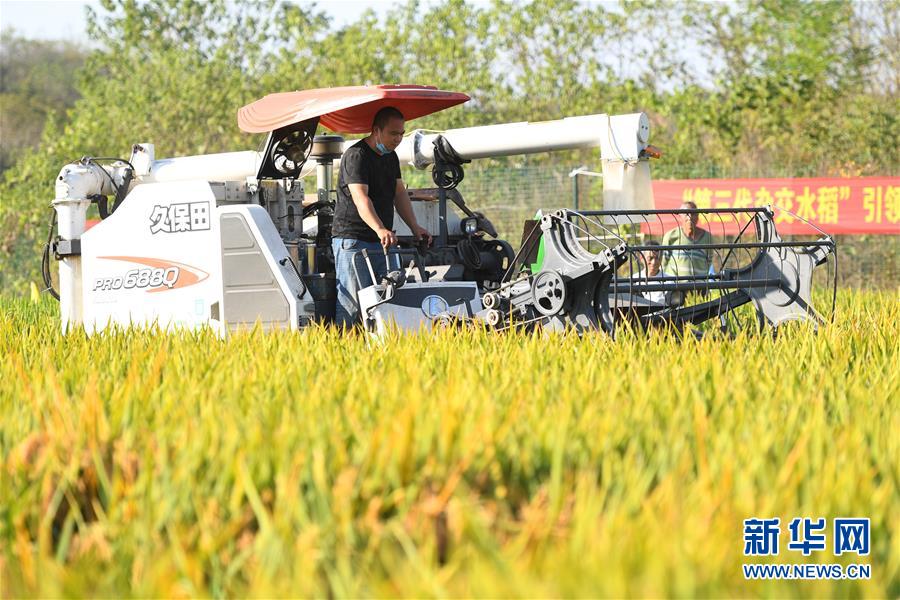 在第三代杂交水稻新组合试验示范衡南基地一块被抽取测产的示范田里,工作人员进行机械化收割测产(10月21日摄)。 新华社记者 陈泽国 摄