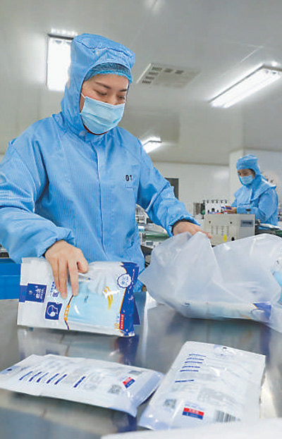 近日,各地口罩生产企业抓紧生产,全力增加市场供应。图为浙江省德清县一家口罩企业生产车间,工作人员在包装口罩。