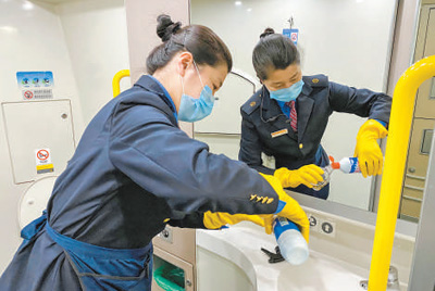 图为南昌开往南京的G1496次列车上,南昌客运段工作人员认真做好车厢清洁、消毒工作。 鲍赣生摄(人民视觉)