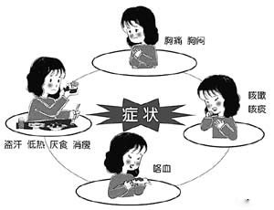 表现为呼吸系统症状:咳嗽、咳痰以及数量不等的咯血、胸痛、呼吸困难等。因此,有咳嗽、咳痰2周以上或伴有咯血等可疑症状者,应及时到各结核病定点医院进行检查和诊断。