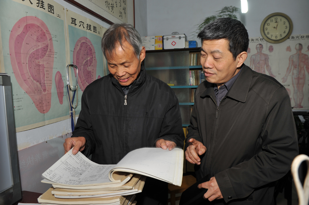 厚厚的病历,是马振业(左)悬壶济世分文不取的见证。图片来源:山西文明办