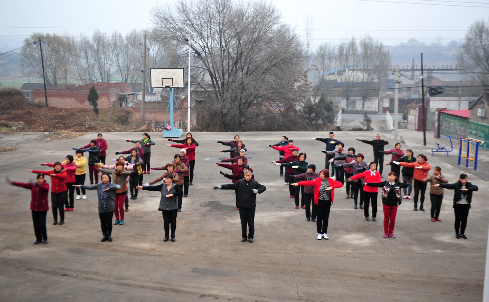 马振业(前排中)正带领村民们进行晨练。图片来源:山西文明办
