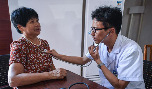 8月8日,在夹浦镇丁新村文化礼堂巡回医疗点,夹浦镇卫生院的医护人员在给村民检查身体。 新华社记者 徐昱 摄