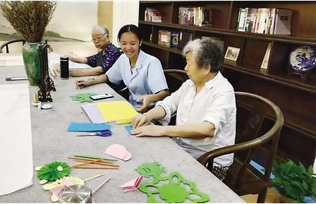 祝婆婆(右)和护士一起做手工 记者 冉文 摄