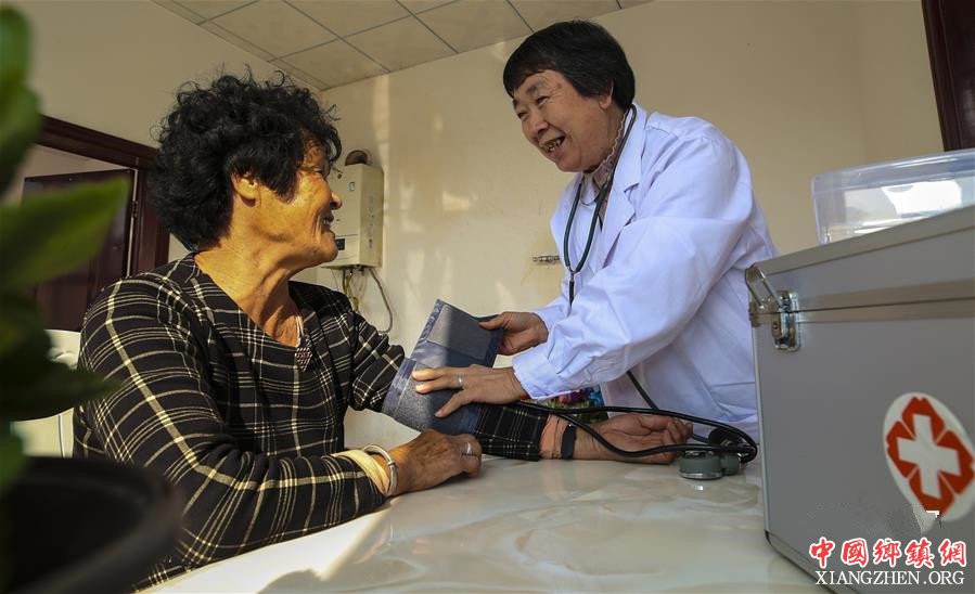 10月19日,在河北省廊坊市广阳区万庄镇潘村,家庭医生为贫困户王淑莲测量血压。新华社记者李晓果摄