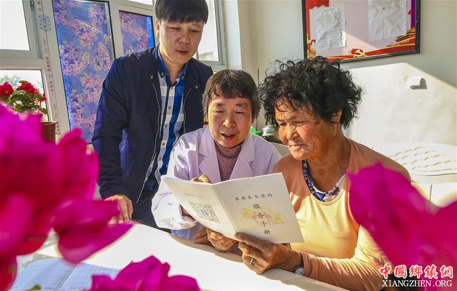 10月19日,在河北省廊坊市广阳区万庄镇潘村,家庭医生为贫困户王淑莲(右一)讲解《家庭医生签约服务手册》。新华社记者李晓果摄