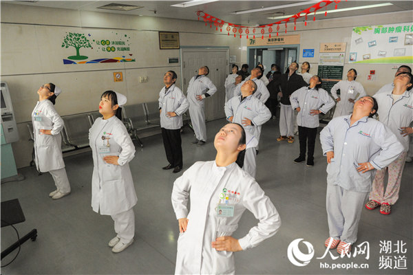 人民网武汉11月23日电 “呼……吸……呼……”伴随着有节奏的音乐,23日早晨7点30分,同济医院肿瘤科病房,肺癌病人正在接受早间的音乐治疗。50岁的彭爹爹是音乐治疗课的忠实粉丝,他笑着说:“每天做做音乐呼吸操,边听音乐边治疗,不仅胸闷缓解了不少,一天的心情都好。”