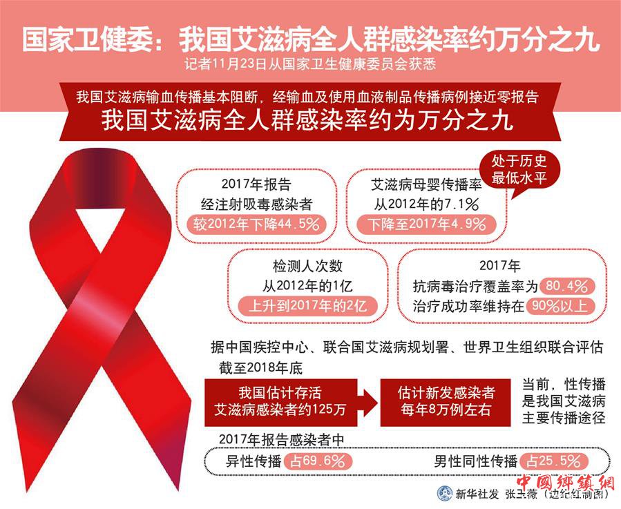 国家卫生健康委员会疾病预防控制局副局长王斌当天在新闻发布会上介绍,我国艾滋病防控工作成效显著,经注射吸毒传播得到有效控制,2017年报告经注射吸毒感染者较2012年下降44.5%。艾滋病母婴传播率从2012年的7.1%下降至2017年的4.9%,处于历史最低水平。