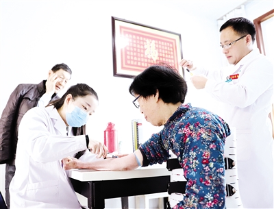 近日,山东省邹平市黄山社区卫生服务中心家庭医生团队登门入户为居家养护的老年人抽血体检。为全面做好医养结合工作,该中心家庭医生团队为辖区行动不便老年患者开展居家老年养护签约服务,开展上门体检、创口护理、精神抚慰、定期随访等服务。记者郝金刚 通讯员郭海涛 王盼盼摄影报道