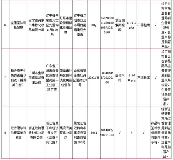 其中,经生产企业所在地药品监管部门现场核查,标示广州柔美伊美容化妆品有限公司生产的馥兰诗晶透沁白淡斑霜,广州市纤雅化妆品有限公司〔委托单位:纤雅国际(韩国)株式会社〕生产的娇伶美白祛斑霜,广州双拾意化妆品有限公司生产的雪飞婷双拾意·双重美白祛斑霜,辽宁省丹东市华特化妆品有限公司生产的宝莲堂祛斑祛皱膏,广州市金栢丽保健品有限公司生产的柏诗春天牛奶瞬透精华仙液(瞬间美白型),浙江欧诗漫特种化妆品有限公司生产的欧诗漫珍珠白精萃美白原液等相关批次产品,生产企业声称为假冒产品。