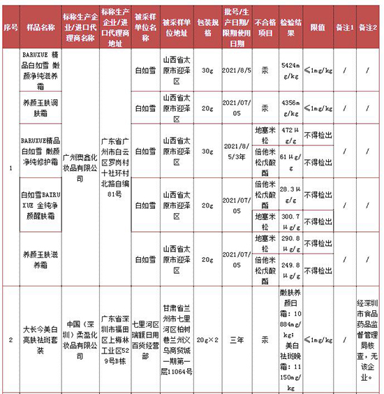涉及的标示生产企业、不合格产品为:广州澳鑫化妆品有限公司生产的BARUXUE 精品白如雪 嫩颜净纯滋养霜、BARUXUE精品白如雪 嫩颜净纯修护霜、白如雪 BAIRUXUE 金纯净颜醒肤霜、养颜玉肤调肤霜、养颜玉肤滋养霜;中国(深圳)柔盈化妆品有限公司生产的大长今美白亮肤祛斑套装,广州柔美伊美容化妆品有限公司生产的馥兰诗晶透沁白淡斑霜;广州市纤雅化妆品有限公司(委托单位:纤雅国际(韩国)株式会社)生产的娇伶美白祛斑霜;广州双拾意化妆品有限公司生产的雪飞婷双拾意·双重美白祛斑霜;辽宁省丹东市华特化妆品有限公司生产的宝莲堂祛斑祛皱膏;广州市金栢丽保健品有限公司生产的柏诗春天牛奶瞬透精华仙液(瞬间美白型);浙江欧诗漫特种化妆品有限公司生产的欧诗漫珍珠白精萃美白原液。