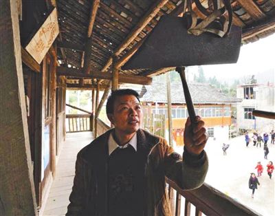 代课教师潘平忠在孖尧教学点教学楼二楼敲简易制作的上课铃。