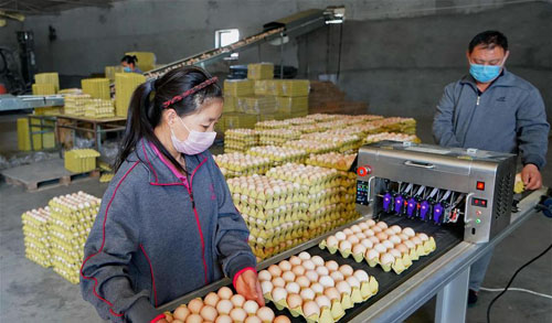 5月22日,宁晋县一家无抗养鸡场的工人在给鸡蛋喷可追溯码。近年来,河北省畜牧大县——宁晋县大力推广无抗生素养殖技术发展设施蛋鸡养殖。据介绍,目前该县建成规模养鸡场60个,存栏290万只,禽蛋年产量2.8万吨。新华社记者 杨世尧摄