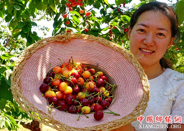 5月30日,游客在秦皇岛市海港区杜庄镇小深港村的果园内展示采摘的樱桃。