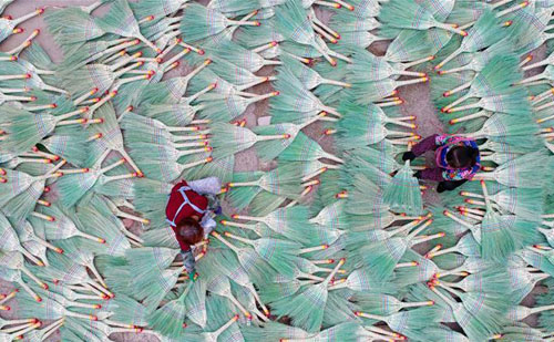 乐亭县毛庄镇永平笤帚专业合作社员工在晾晒扎制好的笤帚(6月19日无人机拍摄)。新华社记者 牟宇 摄